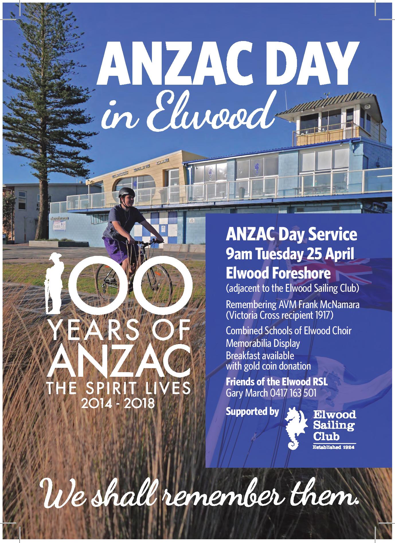 | Please see attached flyer with details for the upcoming Elwood ANZAC Day Service.