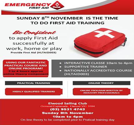 Elwood Sailing Club is running a First Aid Course – any member is welcome to take part – for first time or if you took this course a few years ago as a refresher. It is free to club members (normally priced $100.00 per person) please contact Sarah on manager@elwoodsc.com to book.
